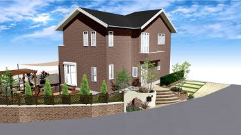 レンガとアンティーク加工が映えるオリジナルな門袖のある庭