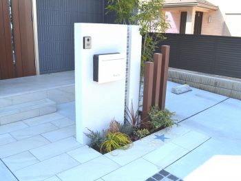 真っ白な門袖には直線的なデザインのポストにグレーのモザイクタイルのアクセントを。すっきりとクールな印象ですが、ブラウンのポールや植栽の緑が殺風景になり過ぎないバランスを作り出しています。