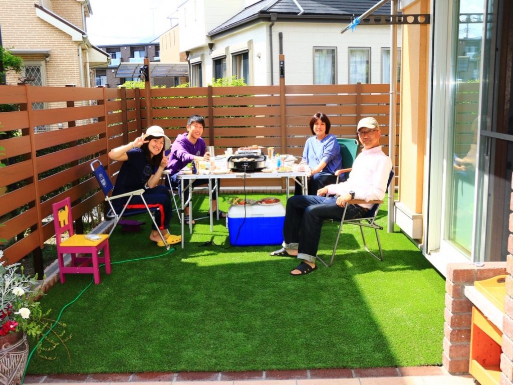 タイルテラスと同じ高さで人工芝の緑のスペースを造り、緑の庭空間も残しました。生垣の代わりに樹脂の木目調フェンスを建て、外からの視線を気にせず、庭で過ごせます。 -