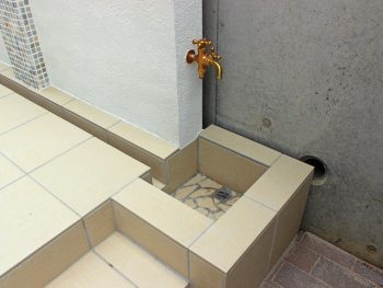 オリジナルウォールの側面には雰囲気のある二口蛇口を設置しました。お水を受け止める“パン”もオリジナルですが、排水溝の下流側にもなっており、排水口も兼ねています。階段もただの段差ではなく形を変化させる事で、階段も1つの大切なお庭のアクセントになり、デザインが活きてきます。 -